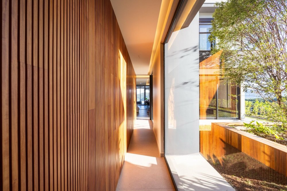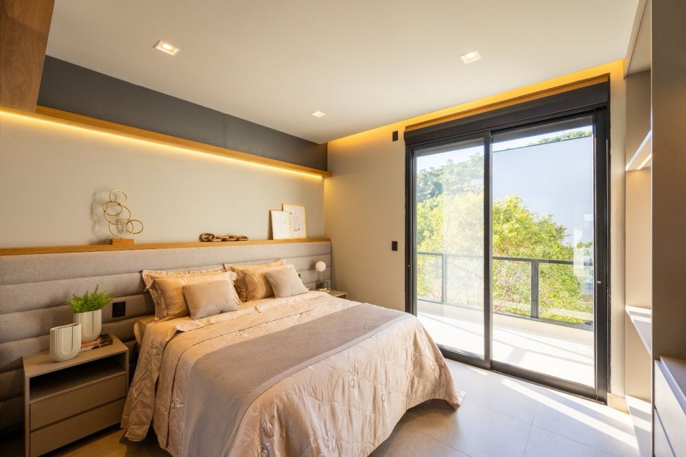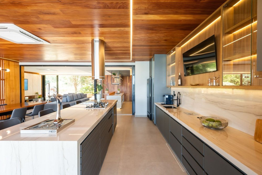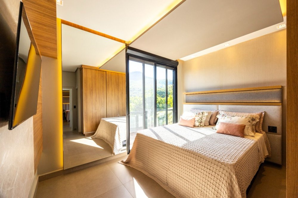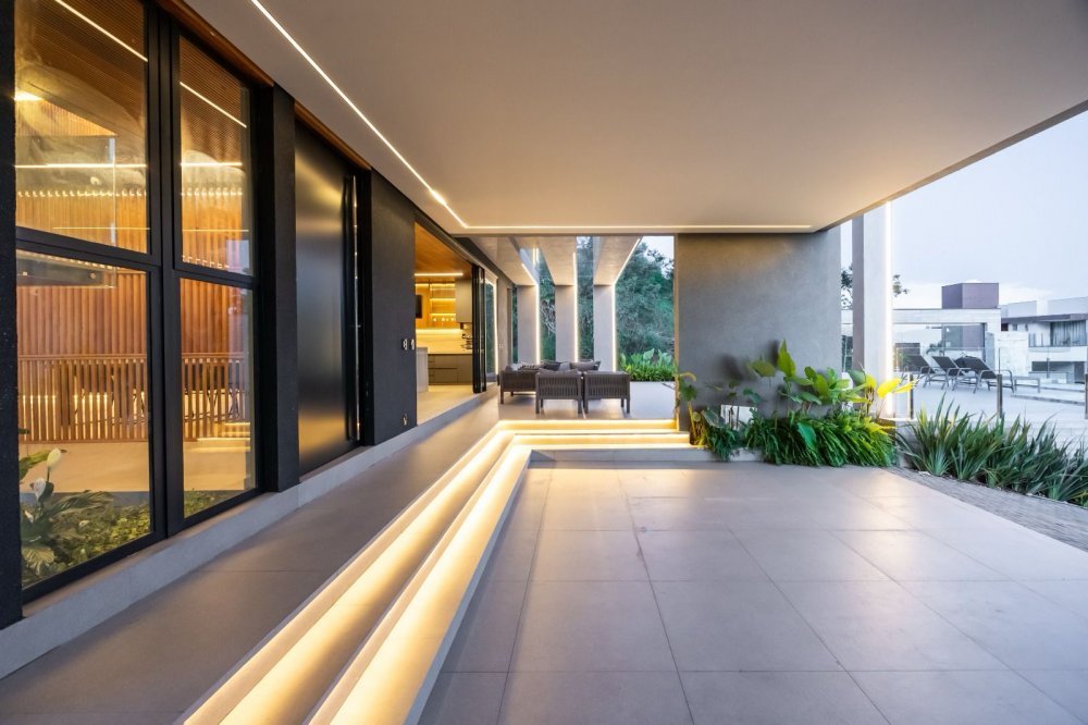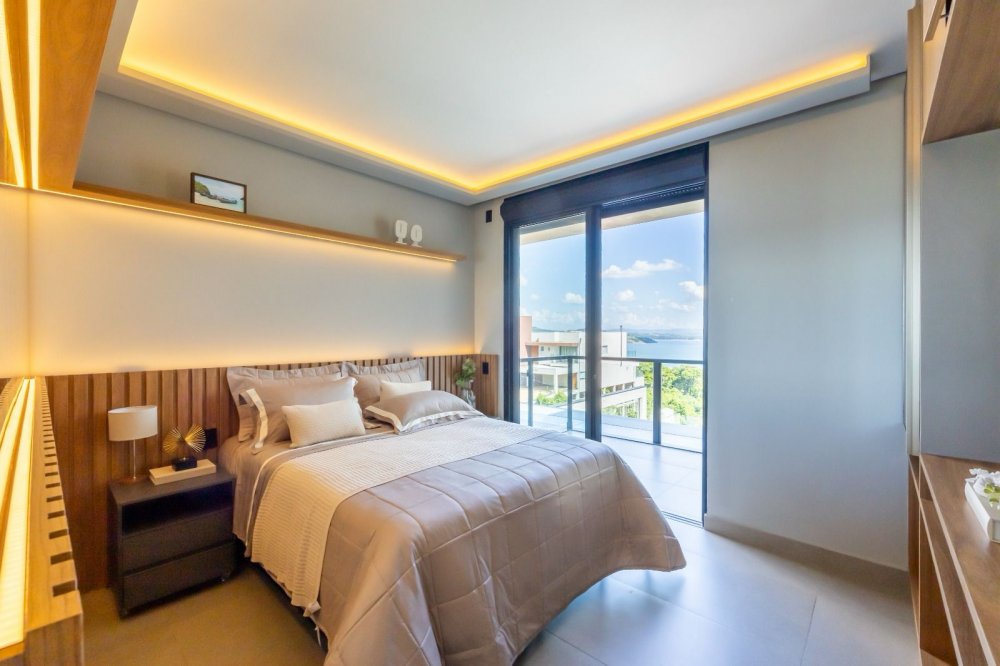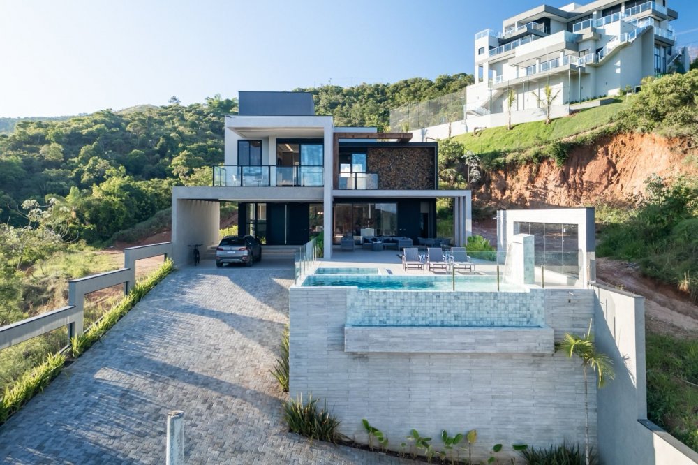 A casa inclui áreas amplas, como uma sala moderna, cozinha integrada e área gourmet, além de garagem para seis carros, piscina aquecida, spa e fireplace a gás. A suíte master destaca-se por sua hidromassagem, closet e varanda com vista para a lagoa.