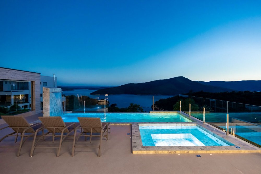 Esta residência em Escarpas do Lago oferece luxo e sofisticação com uma vista deslumbrante para o Lago de Furnas. Com 835m² de terreno e 548m² de área construída, ela possui 8 suítes, todas com ar-condicionado, persianas automáticas e TVs de 50 polegadas, além de varandas com vistas espetaculares.