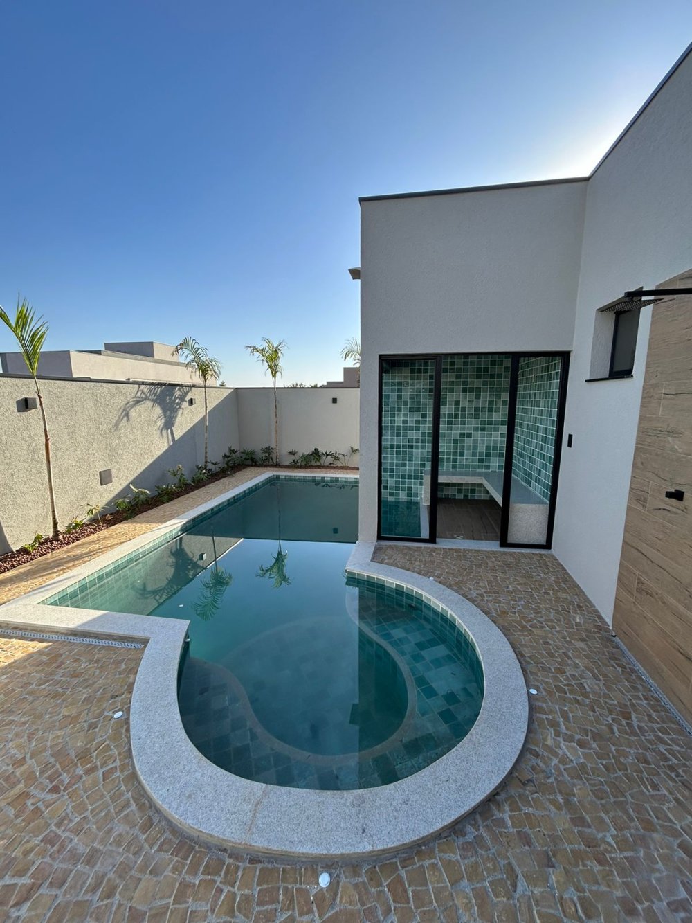 Piscina com aquecimento, hidro, motorização, sauna e cascata