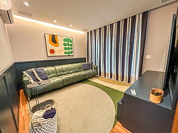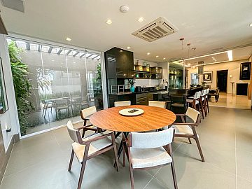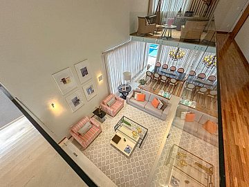 Logo na entrada, o imóvel impressiona com uma sala ampla com pé-direito duplo, proporcionando iluminação natural, sofisticação e sensação de grandeza. O living integra-se de forma harmoniosa aos ambientes sociais, contando ainda com home cinema, lavabo e uma cozinha moderna totalmente integrada ao espaço gourmet.